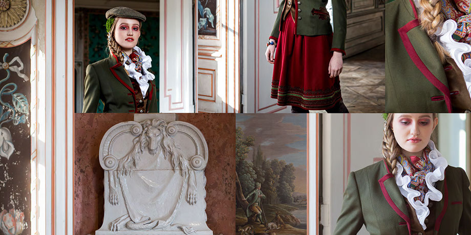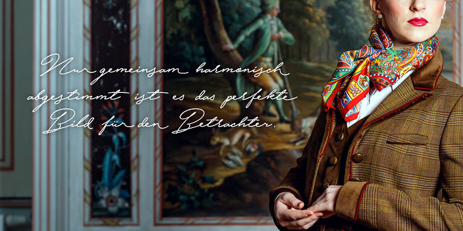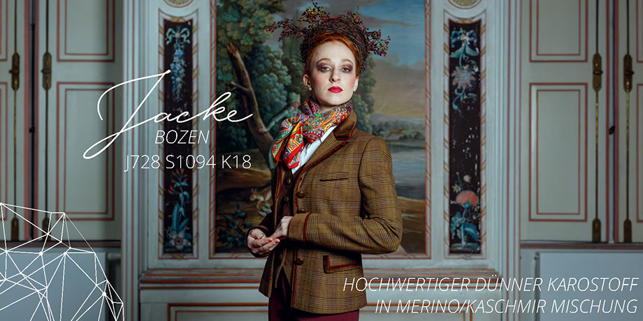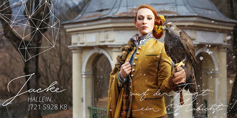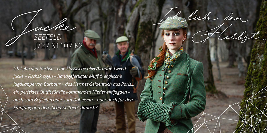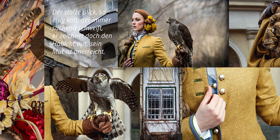 Beize mit Sperber und Habicht & ein schottischer TweedStoff trifft auf feinen österreichischen Loden und eleganten Samt. Die herbstlichen Blätter & die ersten Schneeflocken sind da – „Senf“ - oder doch die gelbe Scharfgarbe aus dem Haarschmuck – ist die Farbe des Herbstes, kombiniert mit dem sportlichen feinen „schon leicht winterlichen“ Blau und dem hellen Moosgrün, dass jetzt von vielen Baumstämmen des Schlossgarten leuchtet.