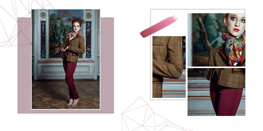 Für diesen hochwertig angefertigten Gehrock habe ich einen Fischgrat-Tweed in Schottland anfertigen lassen – ocker/gelber Farbton mit einem warmen braunen Garn kombiniert, damit sich die Herbstfarben wieder spiegeln - deshalb auch dieser tolle Melange-Effekt. Unsere Knopflöcher werden alle immer von Hand genäht, hier mit Leder ausgeführt. Damit alles sportlicher und frischer wirkt, finde ich die Kombination mit dem blauen Samt perfekt. Darunter trägt unser Model ein klassisches Hahnentritt-Gilet in den passenden Farben - für unser Fotoshooting habe ich einen Rein-Seidenschal von Hubegger/Vienna verwendet und das freche Make-up hat Nadja Tschinder ergänzt.